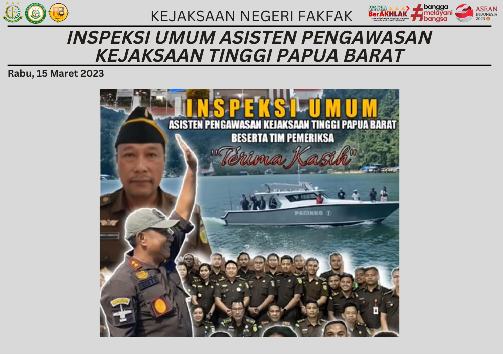 Terimakasih kepada tim pengawasan Kejaksaan Tinggi Papua Barat yang telah melaksanakan Inspeksi Umum Pada Kejaksaan Negeri Fakfak pada Rabu 15 Maret 2023, Inspeksi berjalan dengan lancar dan terimakasih atas masukan dan pembelajaran yang diberikan kepada Kejaksaan Negeri Fakfak