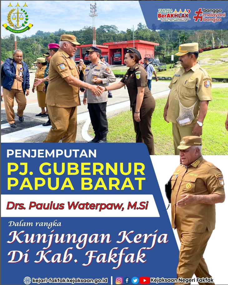 Pada hari Senin tanggal 04 September 2023 bertempat di Bandara Torea Kabupaten Fakfak, telah tiba Pj. Gubernur Papua Barat Komjen Pol. (Purn) Drs. Paulus Waterpaw, M.Si beserta rombongan dalam rangka Kunjungan Kerja di Kabupaten Fakfak. Kepala Seksi Intelijen Kejari Fakfak Sarah Emelia, S.H. hadir dalam acara penjemputan Pj. Gubernur Papua Barat beserta rombongan.