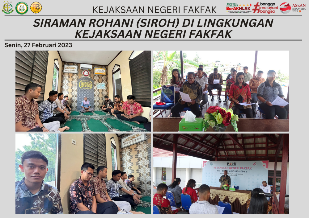 Pada Hari Jumat 10 Maret 2023, Kejaksaan Negeri Fakfak melaksanakan kegiatan Siraman Rohani Islam dan Kristen sebagai bentuk peningkatan keimanan dan ketakwaan, disisi lain juga sebagai sebagai bentuk rasa syukur atas limpahan karunia dan kesehatan yang Tuhan berikan selama ini kepada seluruh keluarga besar Kejaksaan Negeri Fakfak.